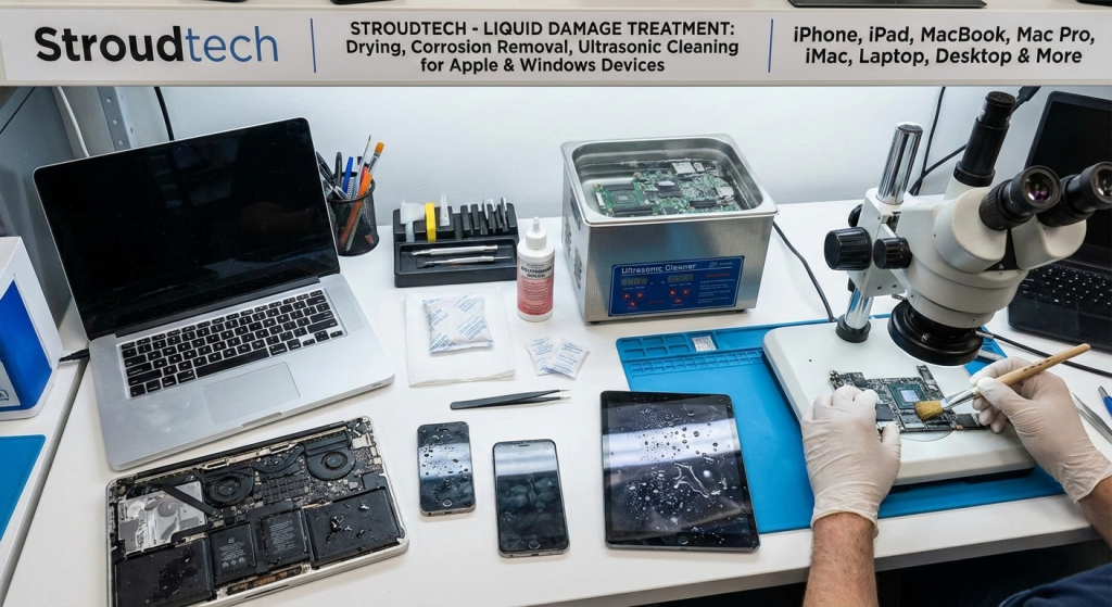 Liquid Damage Repair in Barrie-Innisfil for all laptops, desktops, and mobile devices. Stroudtech repairs liquid-damaged iPhones, iPads, MacBook Pro, MacBook Air, iMac, Windows laptops, and desktop computers. Our technicians treat liquid damage by drying components, removing corrosion, repairing logic boards or motherboards, and performing ultrasonic cleaning to restore your device.